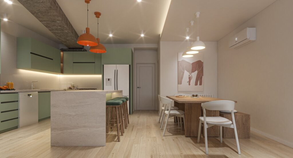 This project focused on the interior design of an 80 sqm apartment in Karaj for a young couple with two cats. The cli ents envisioned a bright, colorful, and personalized space despite the limitation of small windows and restricted day light. They wished for a lively yet functional home, including a workspace, an integrated balcony, and custom elements reflecting their lifestyle.